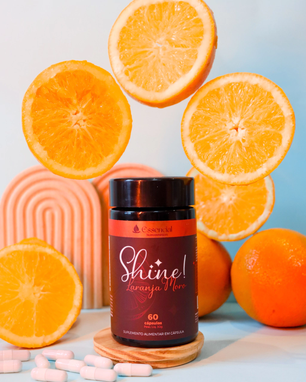 O Shine! Laranja Moro da Soul Glam é um suplemento alimentar em cápsulas formulado com extrato natural da laranja moro, conhecido por sua ação antioxidante e por auxiliar na redução de medidas e na melhora da aparência da pele.
